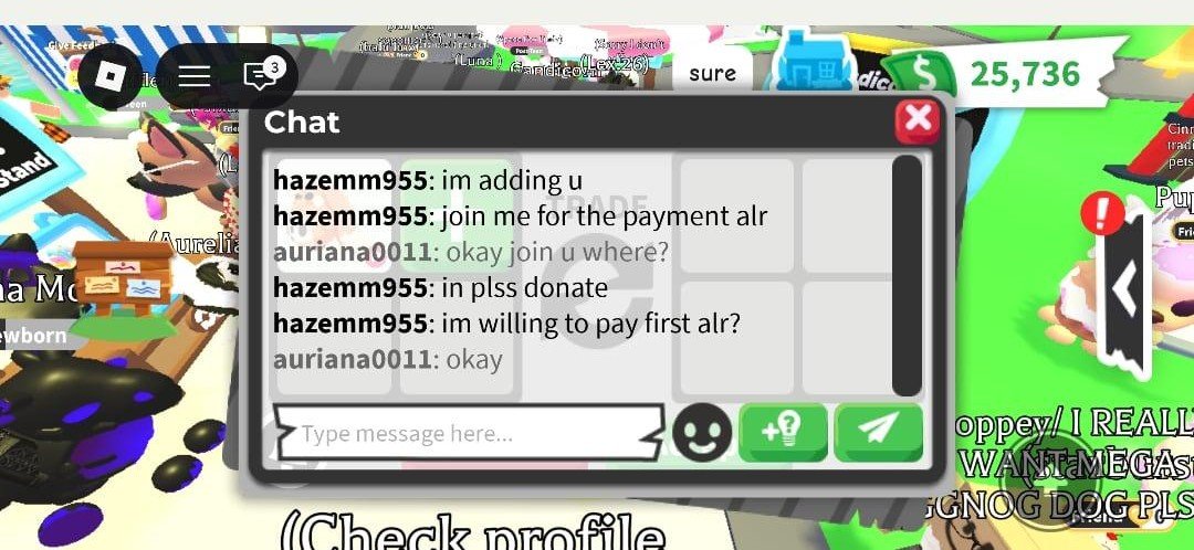 NEW METHOD OF SCAMMING IN ADOPTME PLEASE STAY SAFE, AND PLESSE REPORT THE USER SINCE IM IN A STATE OF GETITNG BANNED.(Thread) so this guy came up to me and said that they wanted to offer for my cabbit and would give me robux. And then said he would give me 15k + would go first.