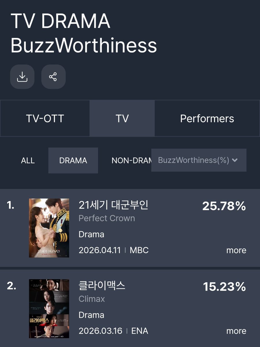 [Fundex 1st week of April] OMG Perfect Crown remained #1 in the Drama-TV category with 25.78%! And look our Daegun Bubu are now #1 and #2 in the Drama Performers category 🥳 #PerfectCrown #21세기대군부인