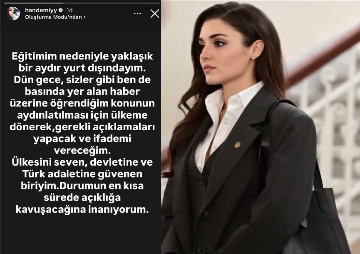 #HandeErçel, sosyal medya üzerinden yaptığı içten açıklamada eğitim için yaklaşık bir aydır yurt dışında olduğunu belirtti ve basında çıkan haberleri dün gece öğrendiğini ifade etti,konunun aydınlatılması için ülkesine dönerek açıklama yapacağını ve ifadesini vereceğini duyurdu