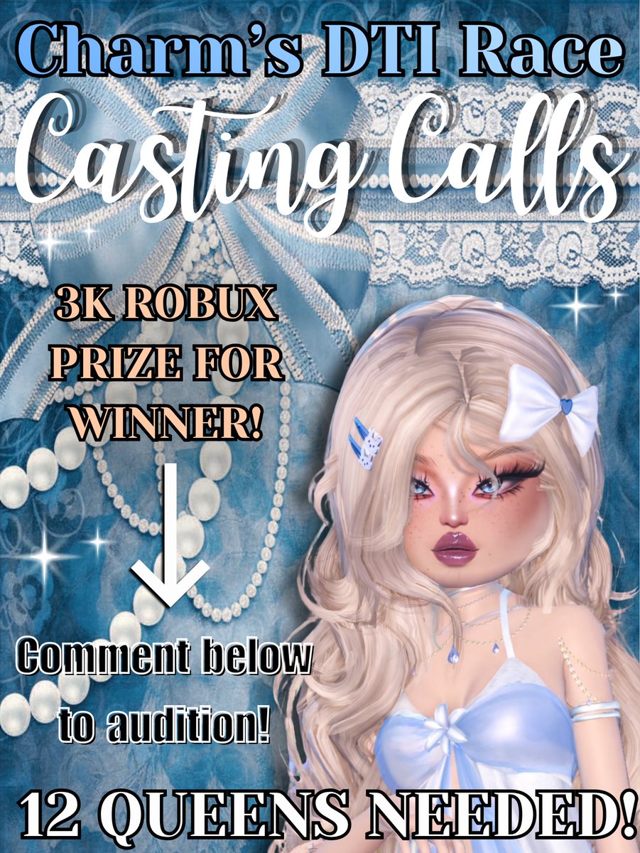 🚨 CASTING CALL 🚨 Charms DTI Race is looking for its first IT girl.✨ 12 queens. One crown. 3K Robux Prize for winner! Do you have the creativity, and the style to outshine 11 other queens? I need a total of 12 divas ready to SERVE. Comment to audition, I’ll DM you. 💋⬇️
