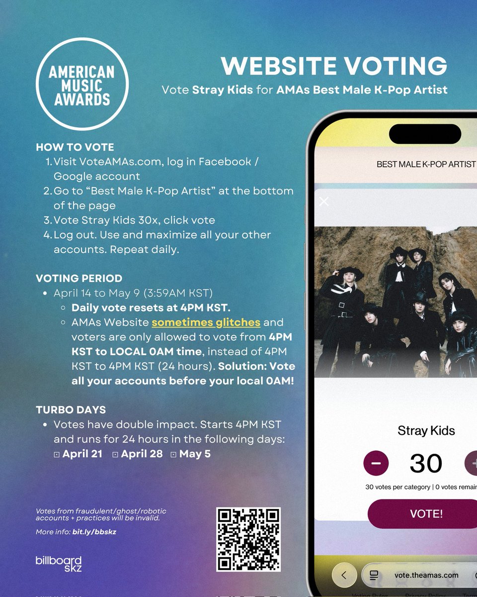 Tomorrow is turbo day for AMA voting(votes count doble), so I better see everyone voting and spreading on timeline #malekpopstraykids #straykidsxAMAs