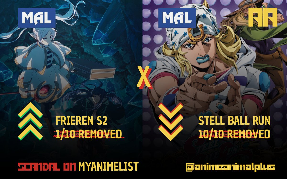 🚨🆕️ Recentemente, o MyAnimeList removeu as avaliações 10/10 de JoJo: Steel Ball Run e as 1/10 de Frieren. No momento, o anime Frieren é o único no MAL que teve as notas 1/10 eliminadas, ao passo que JoJo's Bizarre Adventure: Steel Ball Run é o único anime no MAL que teve as