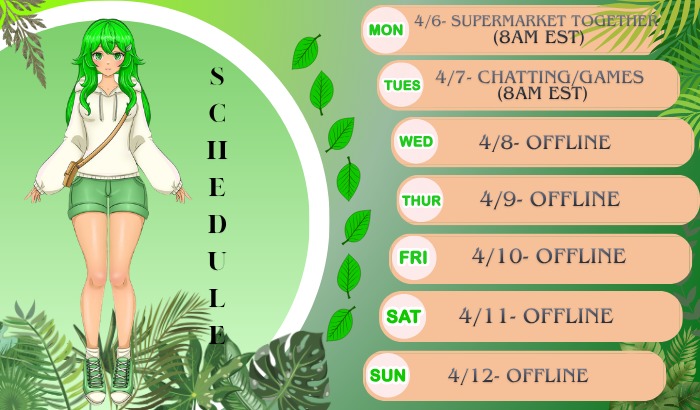 This week schedule I'm streaming right now if anyone wants to chat or enjoy a bit ^^