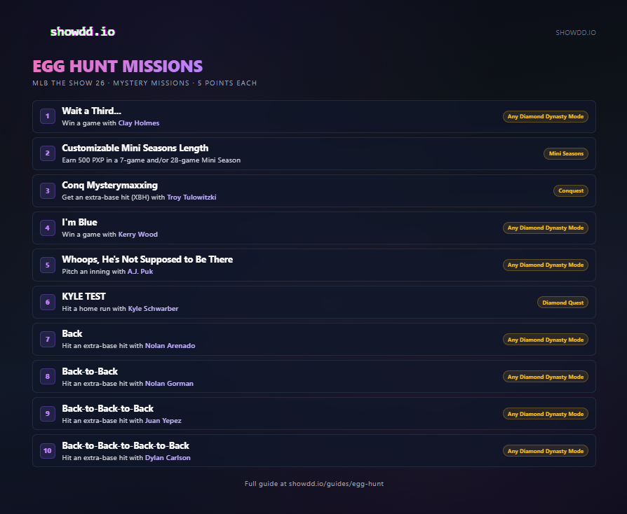 🥚How to complete every Egg Hunt mission and Egg collection! 🐰 1. Wait a Third — Win a game with Clay Holmes 2. Customizable Mini Seasons Length — Earn 500 PXP in 7/28-game Mini Season 3. Conq Mysterymaxxing — XBH with Troy Tulowitzki (Conquest) 4. I'm Blue — Win a