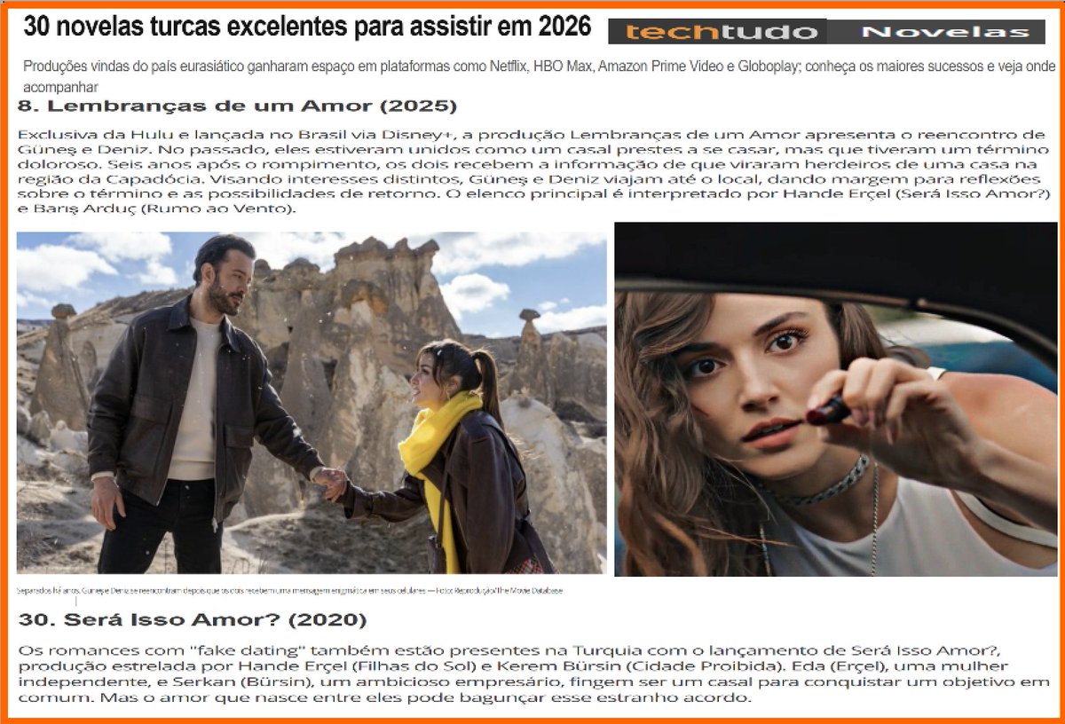 Brezilya’nın en büyük teknoloji ve kültür platformlarından TechTudo, 2026’da izlenmesi gereken Türk dizilerini listeledi. Portekizce yayınlanan bu makalede #HandeErçel’in #BarışArduç'la başrolleri paylaştığı Aşkı Hatırla ve fenomen Sen Çal Kapımı dizileri de yer alıyor #reminder
