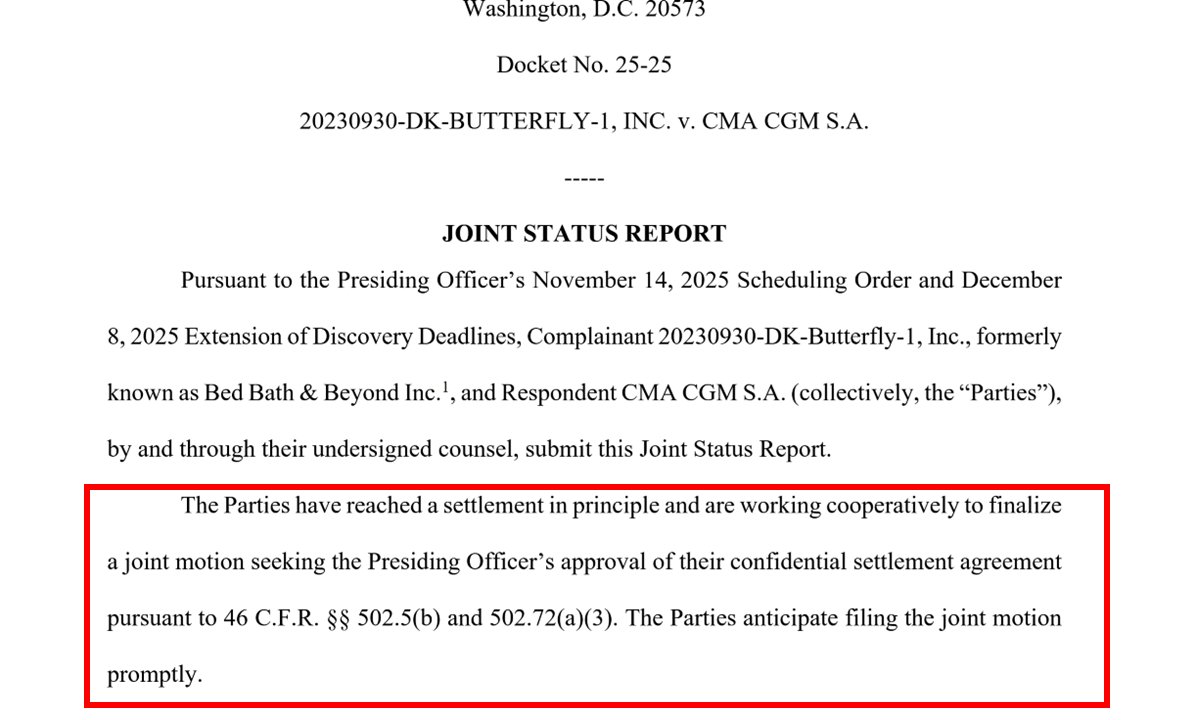 Here is something that flew under the radar. 🔥 20230930-DK-BUTTERFLY-1, INC. v. CMA CGM S.A Docket No. 25-25 DK and CMA have jointly reached a settlement 👀 The timing of this is absolutely insane.