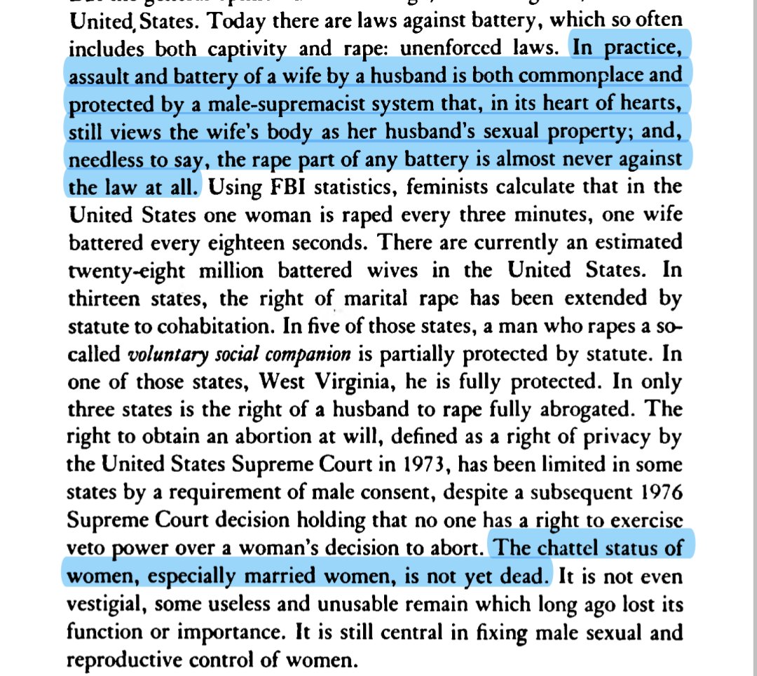 Dworkin points out despite all the advances women have made, married women's bodies are still under their husband's control Pornography, Chp. 4