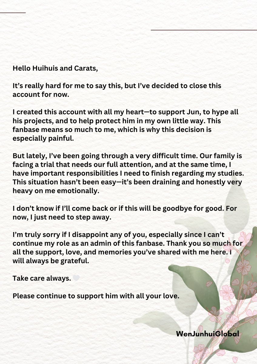 This decision wasn't easy. It's very hard to leave this account that I made, but I have to prioritize my family and my studies. Right now, those are the things I need to focus on the most. Again, sorry to disappoint you and please love, support and protect JUN. THANK YOU! ❤️