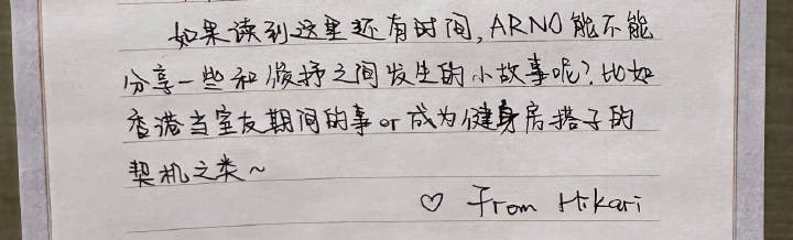 guys… OP posted the letter arno was distracted by on weibo… “If there is still time, can Arno share some stories that occurred between him and Junseo? For instance, what happened when they were roommates in Hong Kong or how they become gym buddies or something similar”