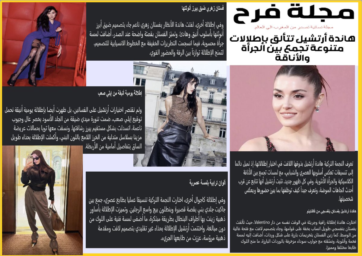Fas'ta yayınlanan Farah Magazine’in son sayısında Hande Erçel’in moda tercihlerini inceleyen bir yazı yayınlandı, farklı görünümleri övgü dolu cümlelerle anlatıldı. Yazıda Hande Erçel, “Cesaret ve zarafeti aynı sahnede buluşturan bir stil ikonu” olarak tanımlanıyor.💙#HandeErçel