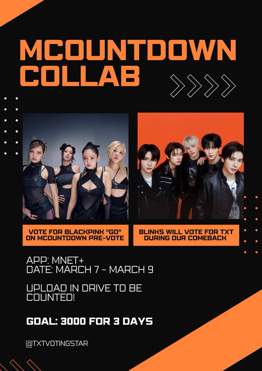 / コラボ投票実施🤝 \ @txtvotingstar × @BP_VotingTeam 🗳投票 MCountdown事前投票にて BLACKPINKへ投票 🗓日程 : 3月7日(土)〜3月9日(月)の3日間 🎯目標 : total 3,000票 ※投票証明の数だけ、TXTカムバ時に還元されます 早めにgoalを達成できれば、さらに追加での票交換の可能性があります⭐️