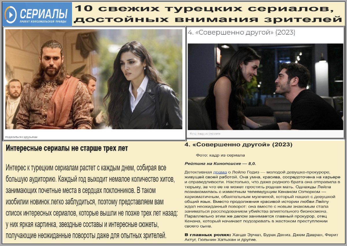Rusya’nın önde gelen kültür portalı "kp. ru", "İzlemeye değer en iyi 10 Türk Dizisi" listesini Kinopoisk puanlarına göre hazırladı. Baş rollerinde #HandeErçel ve #burakdeniz'in yer aldığı #bambaşkabiri (Совершенно другой» -2023) dizisi 8.0 Kinopoisk puanıyla 4.sırada yer aldı🖤