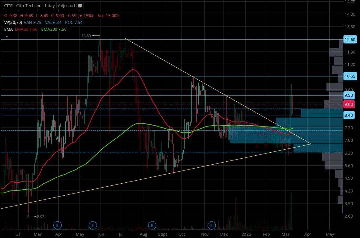 $CITR feels like a microcap entering discovery phase.🚀 For weeks it sat in compression, now it’s breaking structure with volume and momentum. Key levels to watch: Support: $8.40, $8.75 (VAH) Resistance: $9.50, $10.55, $12.60 major magnet EMA50/200 both supportive below price