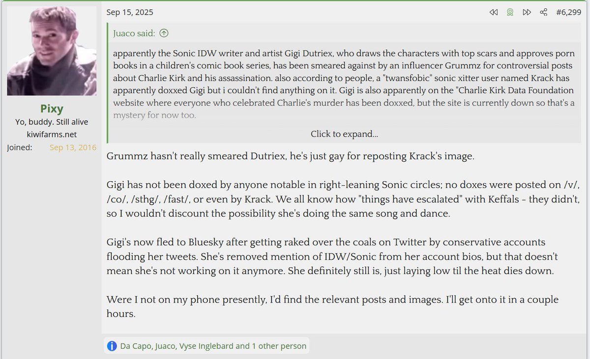 To confirm, everyone's suspicion literally the kiwi farms had seen zero traffic on any right-wing Sonic related circles with her information. To the shock of no one the non-conforming Ginger lied what a shock