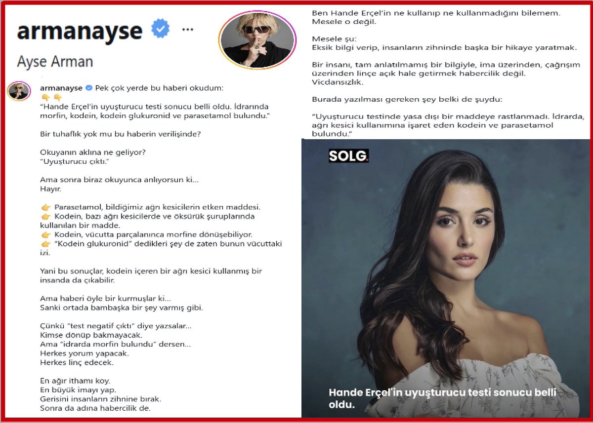 Ayşa Arman #HandeErçel'in test sonuunun negatif çıkmasını algı yaratacak şekilde paylaşan gazetecileri eleştirdi:"Yazılması gereken şey belki de şuydu:“Uy.şt.rucu testinde yasa dışı bir maddeye rastlanmadı.İdrarda,ağrı kesici kullanımına işaret eden kodein ve parasetamol bulundu”