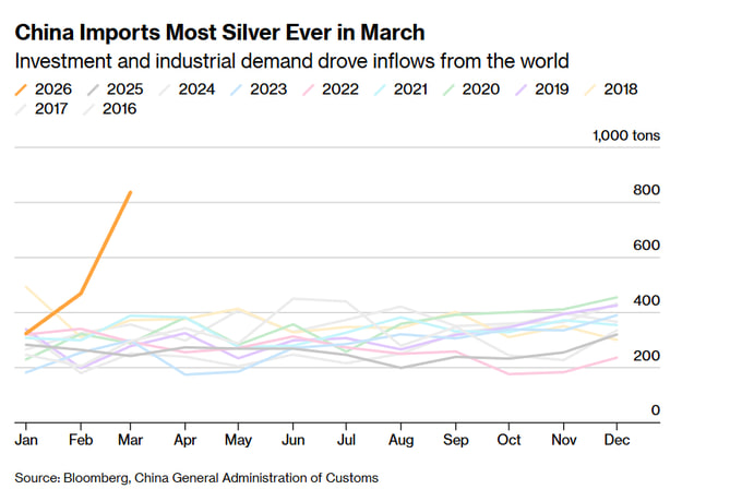 Silver imports to China for March breaks records, industrial demand for Silver is increasing as supply is threatened by Diesel and Sulfuric acid shortages, invest accordingly