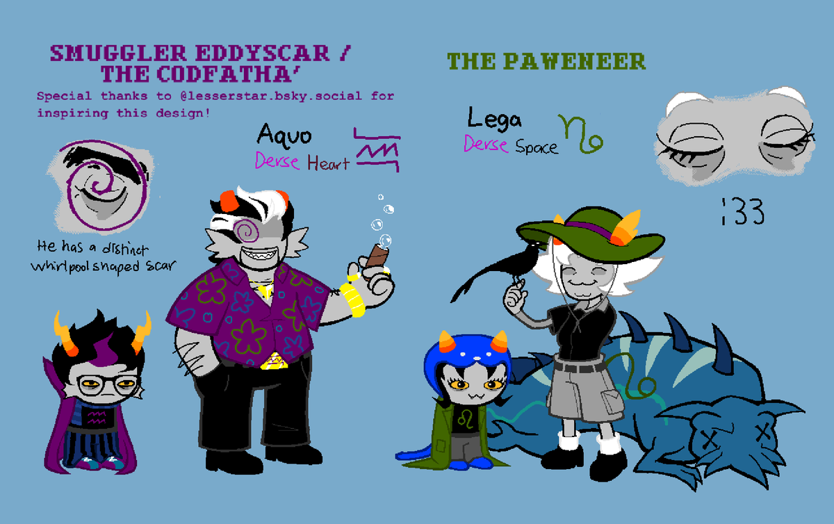 The penultimate Lusus Trolls. Eridan's dad and Nepeta's mom are moirails, who seem to run some kind of animal smuggling ring?? He is the head of a nautical mafia, and shes a naturalist & hunter of beasts