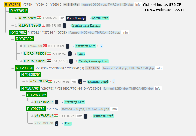 Patrilineal lineage R1a-Z93 > CTS6 > Y37891 is shaping up to be one of the original Kurdish genetic markers. It is currently shared between three lines: the Rabatî family, as tested by Hawpa leader Sarhoz Rabaty; secondly various Kurmanjis, particularly from the Shadiyan and