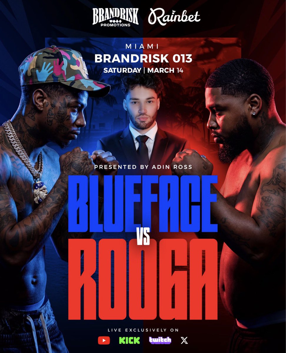 🚨Main Event Announcement 🚨 ‼️🥊 Brand Risk Promotions 013 👥 Blueface vs Rooga 🗓️March 14th, 2026 ⏰ 8PM EST Miami, Florida 🇺🇸 Main Event Announcement 🚨 Full card dropping this week‼️🔥