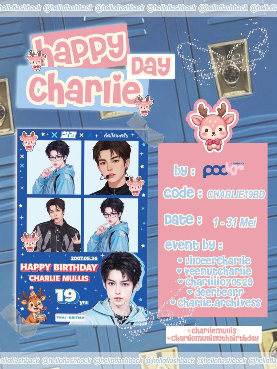 Charlie’s 19th Birthday Project 🦌✨🎂 (Thailand 🇹🇭 × Indonesia 🇮🇩 Fan Collaboration) Celebrate Charlie’s 19th with exclusive photobooth frames 📸✨ Now available at Hello Pockr locations in Thailand 💙 📅 Event period: May 1–31, 2026 📍 Hello Pockr Locations • Bangkok: Siam,