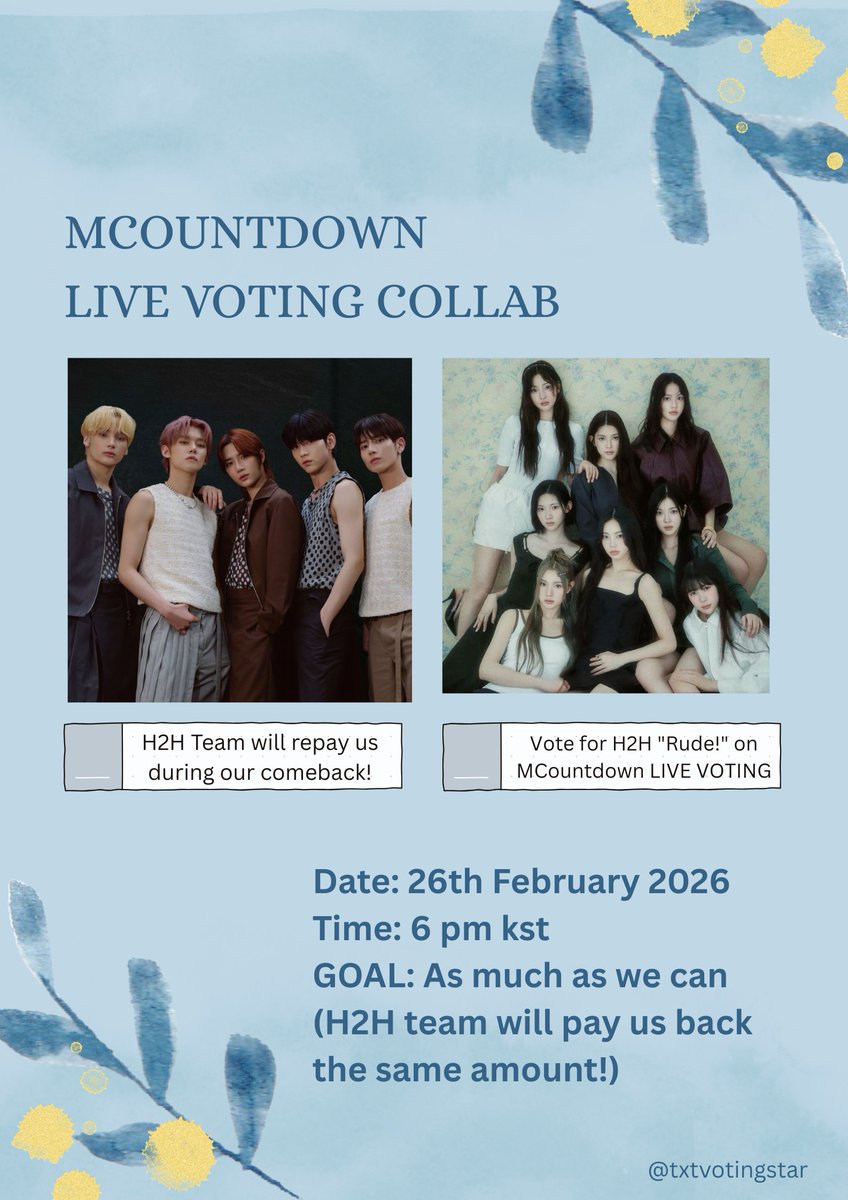 ☆ COMEBACK COLLAB ☆ @txtvotingstar × @H2HBase_ Vote for Hearts2Hearts in MCountdown LIVE vote!! Date: Feb 26, 2026 at 6pm kst App: Mnet+ Drive: GOAL: AS MANY AS POSSIBLE (They will repay us the same amount) Drop your votes in the drive to be counted!