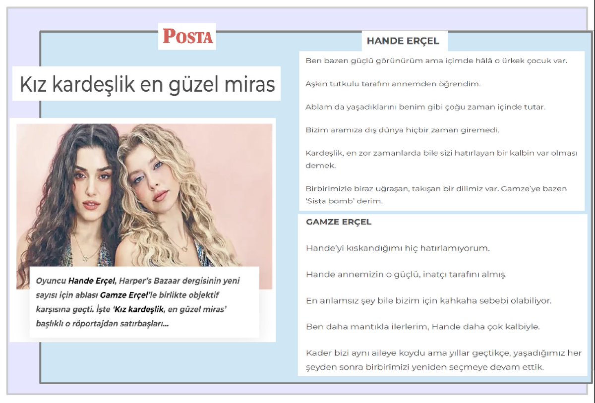 Posta Gazetesi bugün Hande Erçel’in Harper’s Bazaar Mart Sayısı için ablası Gamze Erçel'le birlikte yaptığı çekimde verdiği röportajdan bahsediyor:"Kız kardeşlik en güzel miras." 💙#HandeErçel