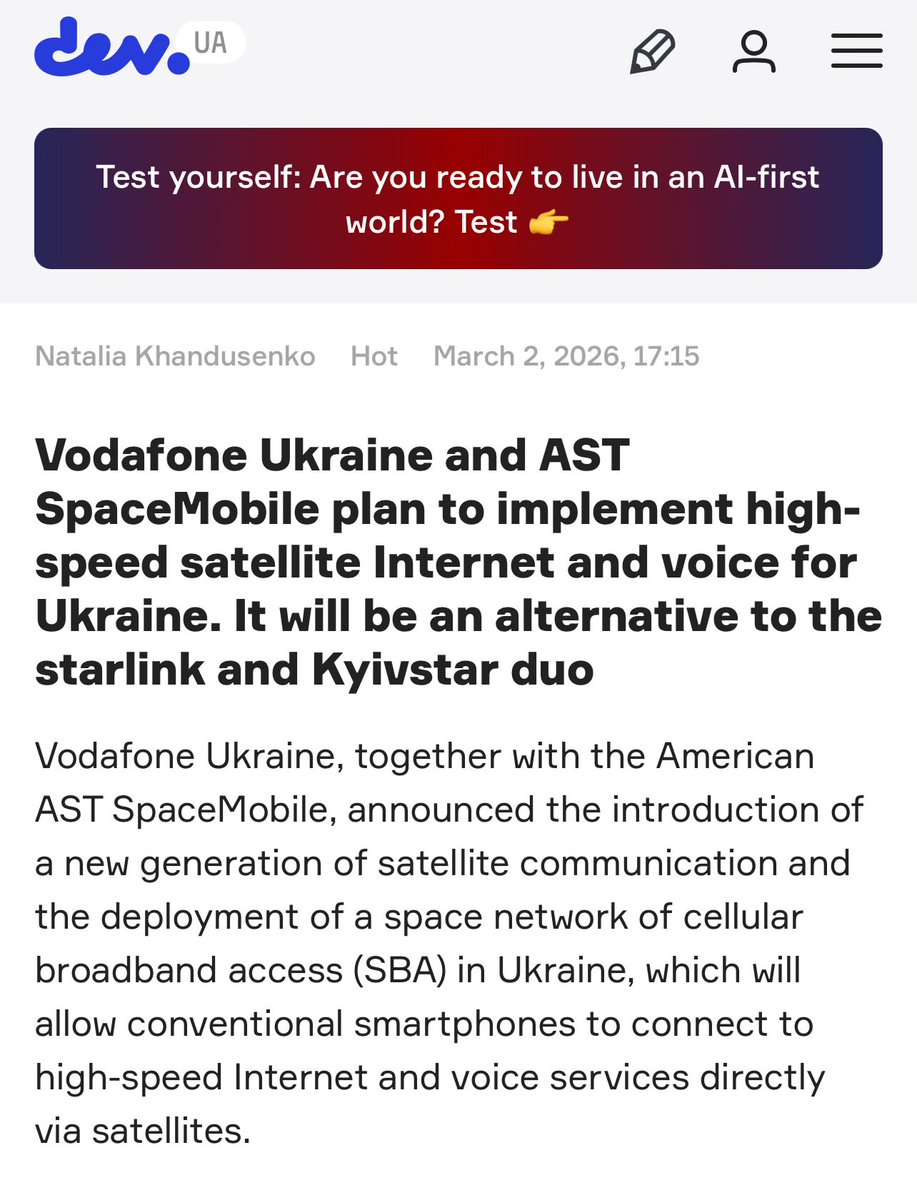 $ASTS: Vodafone Ukraine and AST SpaceMobile plan to implement high-speed satellite Internet and voice for Ukraine. It will be an alternative to the starlink and Kyivstar duo “Vodafone Ukraine and AST SpaceMobile announced the signing of the relevant Memorandum at the MWC”