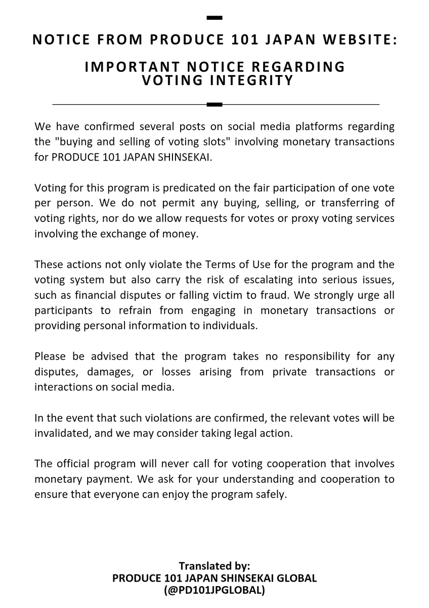 [📢] WARNING REGARDING VOTING We have confirmed posts on social media regarding the "buying and selling of voting slots" involving monetary transactions in relation to PRODUCE 101 JAPAN SHINSEKAI. #PRODUCE101JAPAN新世界 #101SHINSEKAI #日プ新世界 #101SHINSEKAIGLOBAL