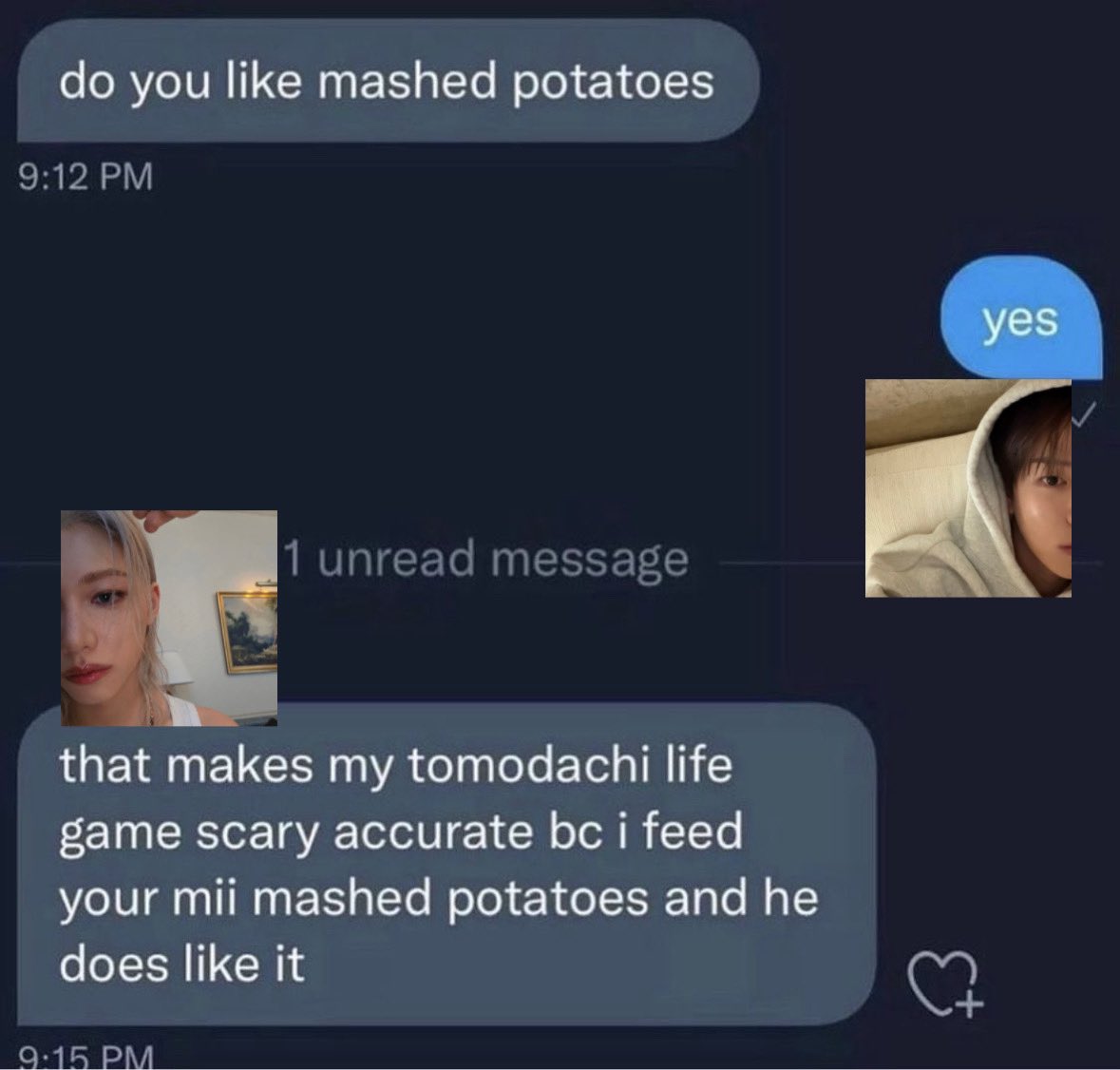 the idea of lix making ksm a mii as a joke but tries to make it as similar to ksm as possible, asks random questions like this, spends time playing when ksm is on schedule, and gains feelings for ksm irl bc of this but is too embarrassed to confess bc it all started w a mii