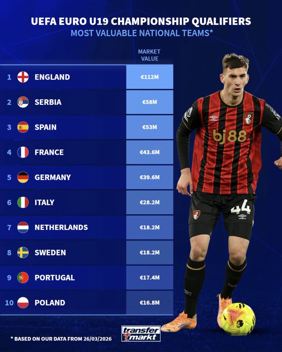 Prema sajtu @Transfermarkt, U19 reprezentacija Srbije je druga najvrednija u Evropi! 💯 Ispred nas su samo omladinci Engleske. I to sve bez Vasilija Kostova koji vredi 10m evra. Ovu generaciju ne smemo da upropastimo jer nam je ova generacija spas kada se radi o reprezentativnom