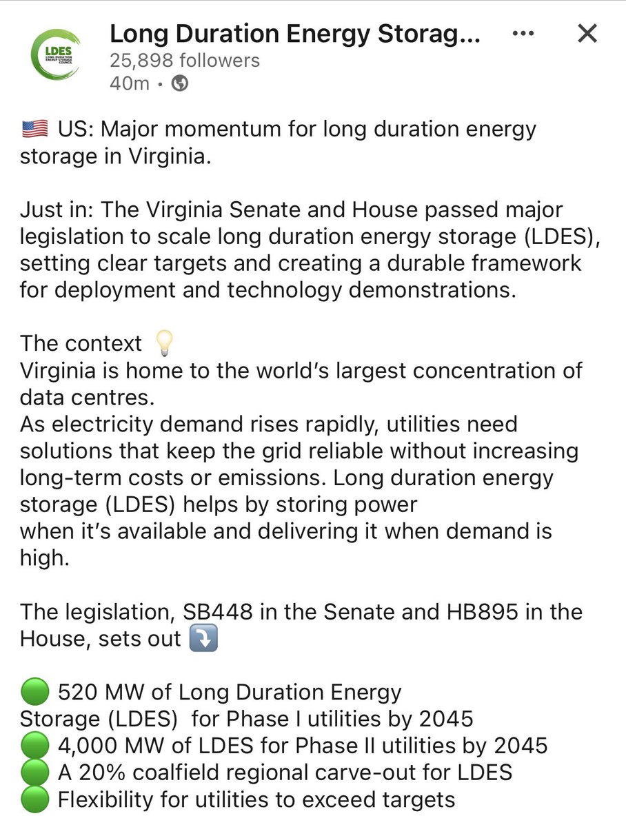 $EOSE “Just in: The Virginia Senate and House passed major legislation to scale long duration energy storage (LDES), setting clear targets and creating a durable framework for deployment and technology demonstrations.”