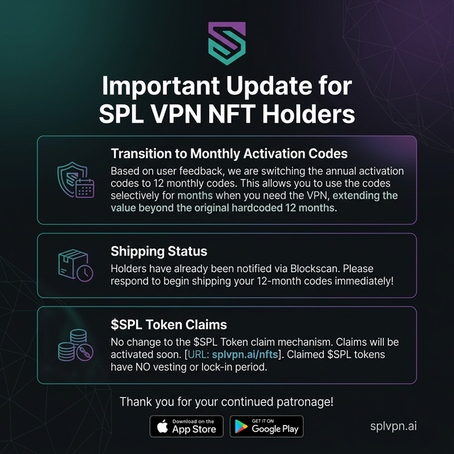 Important Update for SPL VPN NFT Holders regarding switching from annual activation codes to monthly activation codes, giving you extra runway to use the VPN beyond the hardcoded 12 months! And also pertinent information on the forthcoming $SPL claims.