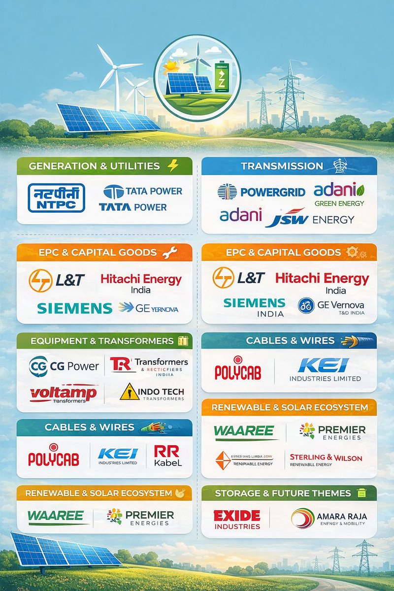 Companies which can benefit from these investments in the Power Sector - 1️⃣ Generation & Utilities => NTPC – Thermal giant turning into renewable + hydrogen powerhouse => Tata Power – Integrated play across renewables, EPC, and distribution => Adani Green Energy – Scale-driven