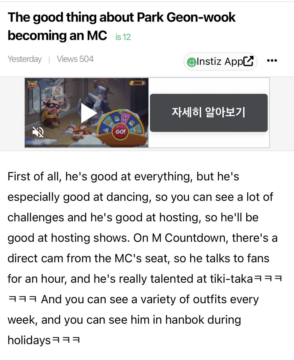 this instiz post discussed all the good things about gunwook becoming an mcountdown mc and the key takeaway is he is good at everything and we will get a lot of content 🫶 🖇️