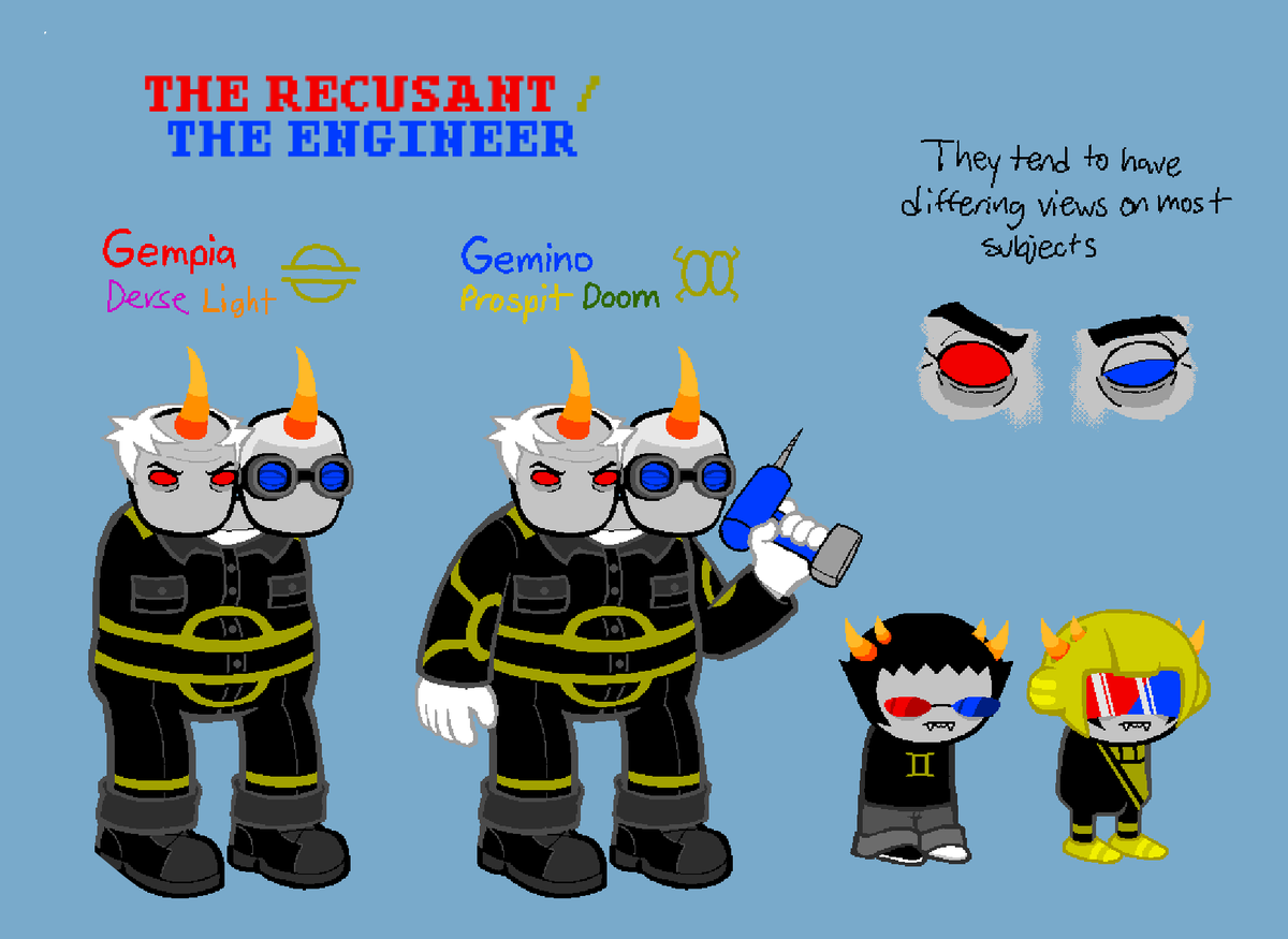 The Lusus Trolls are back for REAL this time! The Recusant and The Engineer are the conjoined twin fathers of Sollux (and also Mituna pre-scratch). The Recusant is a follower of the Signless, while The Engineer does not care about all that political stuff