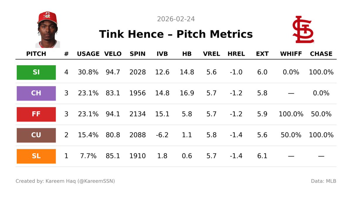 Here are Tink Hence's pitch metrics from today
