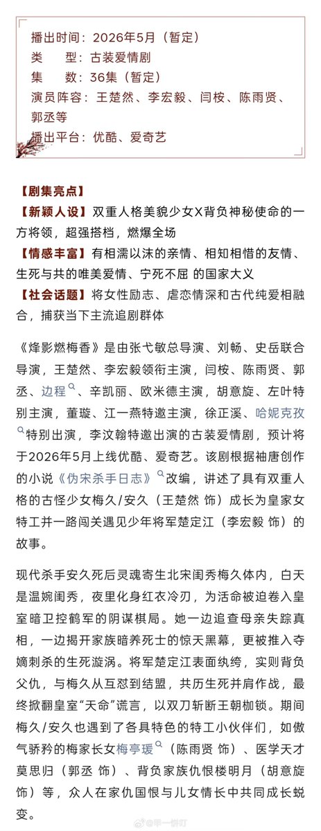 #HiddenShadow (#烽影燃梅香), starring #WangChuran, #LiHongyi, and #YanAn, has launched pre-broadcast investment recruitment (advertising) and is expected to air on Youku and iQiyi this May.