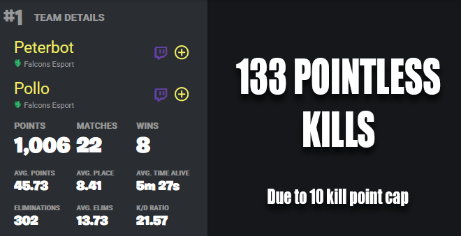 Despite getting 1006 points across two days in an insane performance by Peterbot and Pollo - 1/3rd of their kills didn't count due to the 10 kill point cap Fragging just for the fun of it 🫡