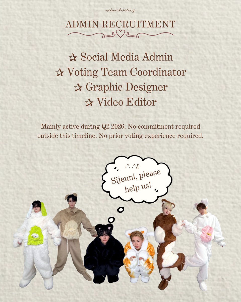 [Road to NCT WISH 1st Full Album] ˚₊‧꒰ა ADMIN RECRUITMENT ໒꒱ ‧₊˚ Help us ensure the success of NCT WISH's upcoming comeback by applying for the following positions: ✰ Social Media Admin ✰ Voting Team Coordinator ✰ Graphic Designer ✰ Video Editor Mainly active during