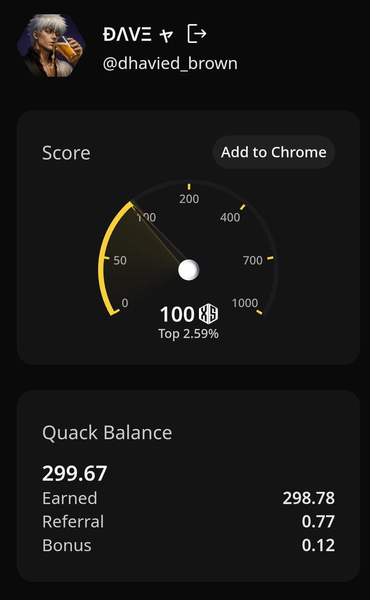 Quack Balance: 299.67 🦆 @wallchain The grind is adding up, one day at a time. Breakdown: · Earned: 298.78 · Referral: 0.77 · Bonus: 0.12 Top 2.59% on the leaderboard. That's not luck, that's consistency. From 265.24 to 299.67 since February 14. The snowball keeps rolling.