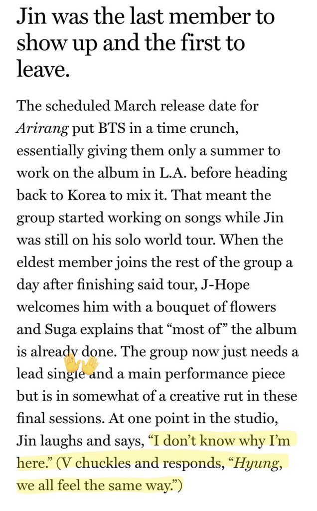Soo we are talking about the part of the article that talk about Korean lyrics and unimportant junk but not the part that they told Jin the album is completed without him …. Im still kind of new so can someone tell if this what it means to be an ot7 army? Im kinda struggling