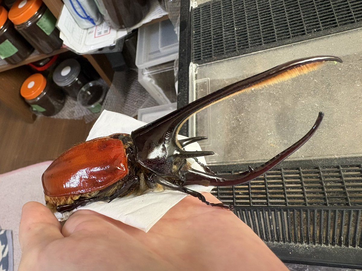 長いの羽化したよ。 縮んだら15cm残らんと思うけど、頭角形状と低体重からの高還元率には満足。この型で140g乗せたら16cmも夢ではない。 #ネプチューンオオカブト